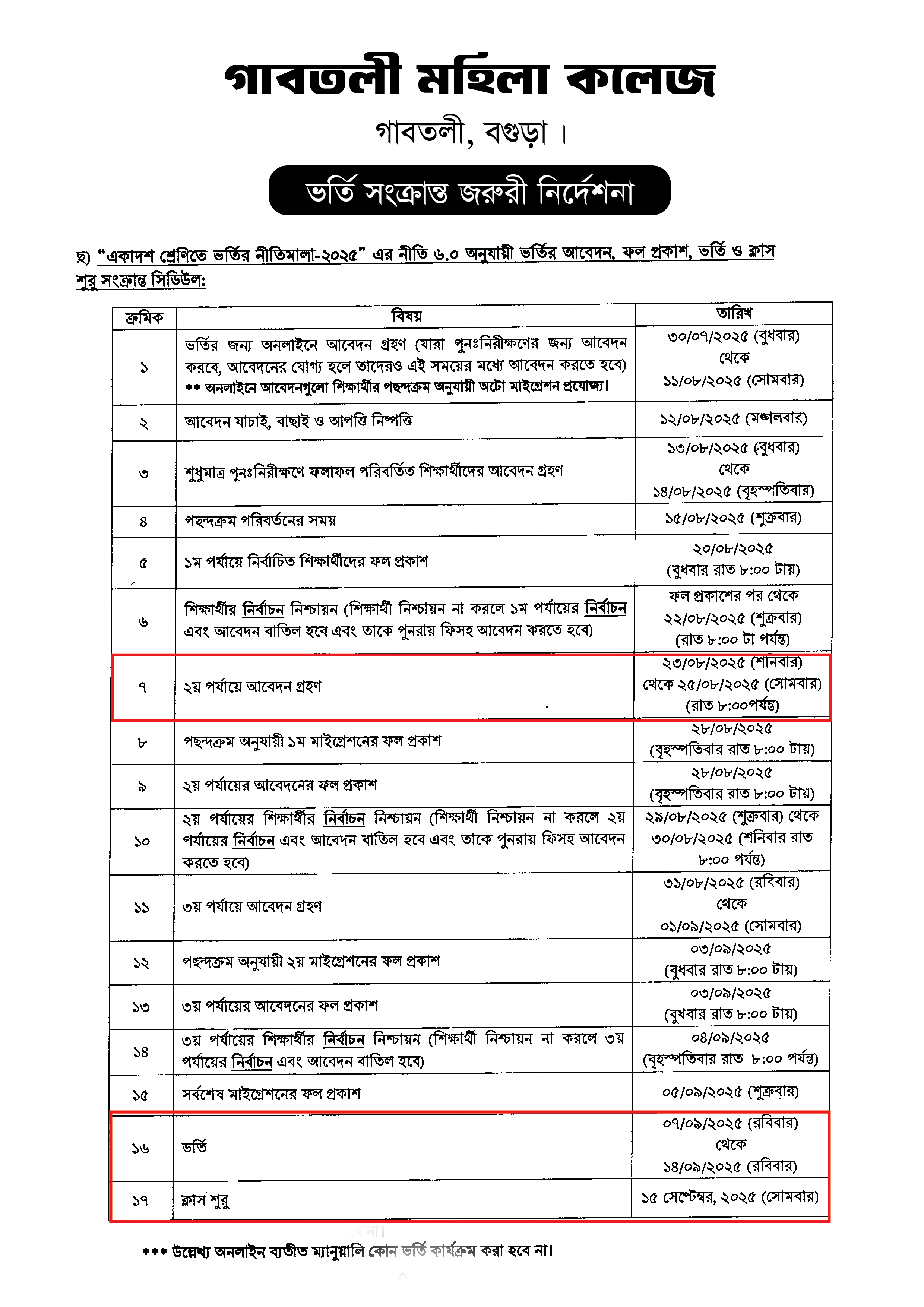 জরুরি নোটিশ : >> গাবতলী মহিলা কলেজ << "নারী শিক্ষা উন্নয়নে উন্নত নারী শিক্ষাঙ্গণ", ২০২৫ -২০২৬ ইং শিক্ষাবর্ষে একাদশ শ্রেণীতে ভর্তি ইচ্ছুক শিক্ষার্থীদের অবগতির জন্য জানানো যাচ্ছে যে অনলাইনে ভর্তি ফরম পূরণ পূর্বক টাকা জমা দিয়েছে কিন্তু ফরম অফিসে এখনো জমা